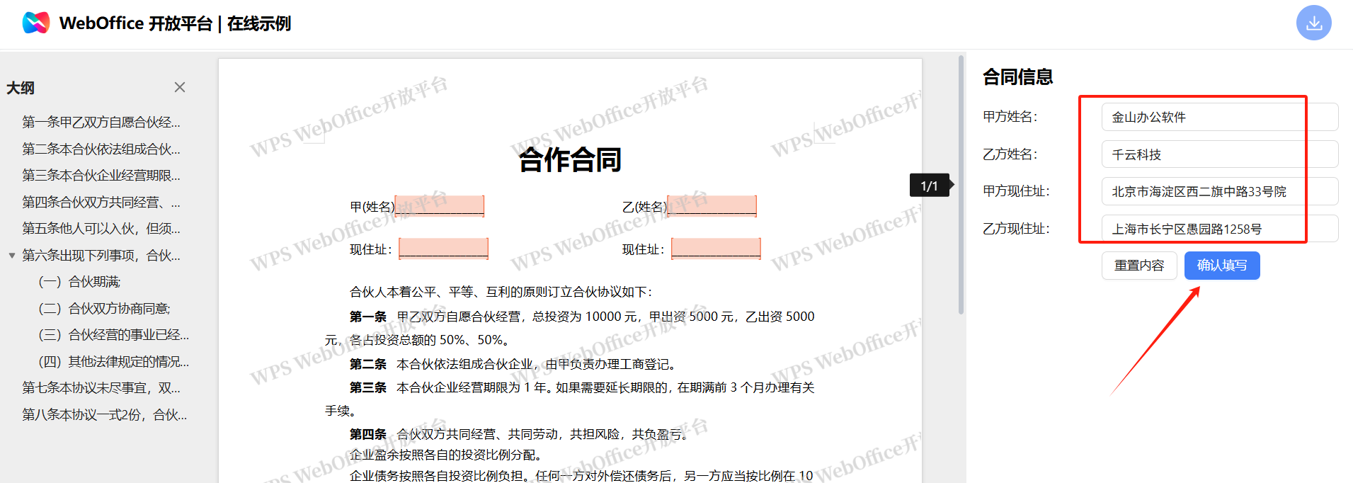 在体验 WPS WebOffice 的 “公文域 / 书签:文档和内容快速填充” 功能后,我认为该功能非常实用。在实际业务场景中,我们经常会用到特定模板的文件,以标准合同为例,合同中的大部分权利、义务、条款等内容属于固定格式,无需频繁修改,而每次使用时仅需修改甲乙方信息、合同金额、时间周期等特定部分。“公文域 / 书签:文档和内容快速填充” 功能恰好解决了这一痛点,它能够精准地在特定模板文件中修改特定位置的内容,极大地提高了文档处理的效率。在实际操作过程中,我提前准备好需要填充的信息数据,按照功能指引进行操作,很快就完成了合同内容的填充,整个过程流畅且高效,相比以往手动逐一修改,节省了大量时间。